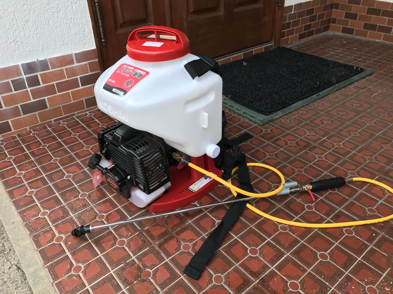 動力噴霧機もピンキリですが、国産の最も安そうなものにしました。中国製でもっと安いものもありますが、重いのと品質に不安があるので国産にしました。
