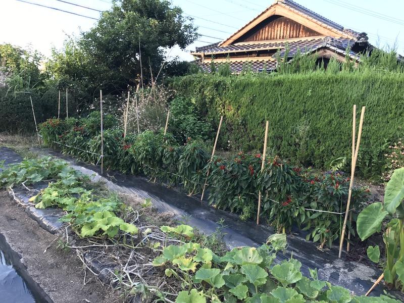 トウガラシ(鷹の爪)が赤くなってきれいです。実が枯れて収穫するそうなので収穫は9月末の予定です。