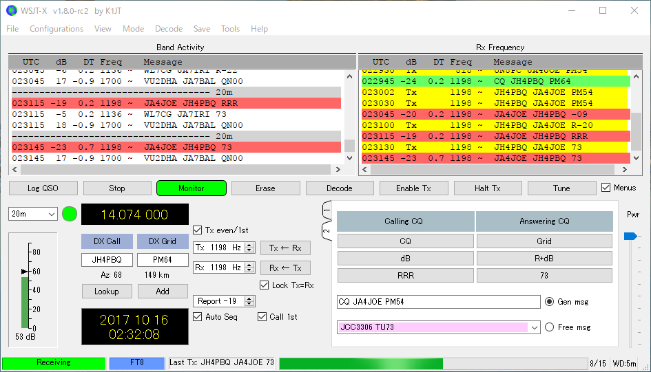 自動シーケンスで気づいたところでは、CQを出している局を呼んだ際にCQ局が他の局と交信を始めると自動的に送信(Enable Tx)がOFFになるようになりました。 これで、他局が選ばれた後に慌ててHaltする必要が無くなりますね。