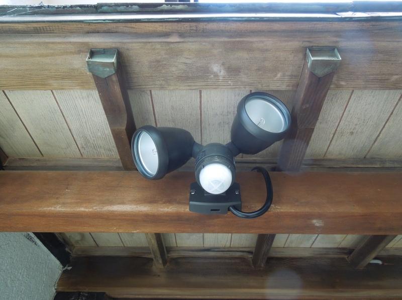 取付け後動作確認を行いましたが、門を2mくらい入ると点灯します。もっと手前から点灯したほうが良いですが、高感度にすると前の道路を通る車に反応するので広角中距離に設定しました。感度調整はセンサー部のレンズを回転させて行います。点灯時間は2分くらいにしておきました。