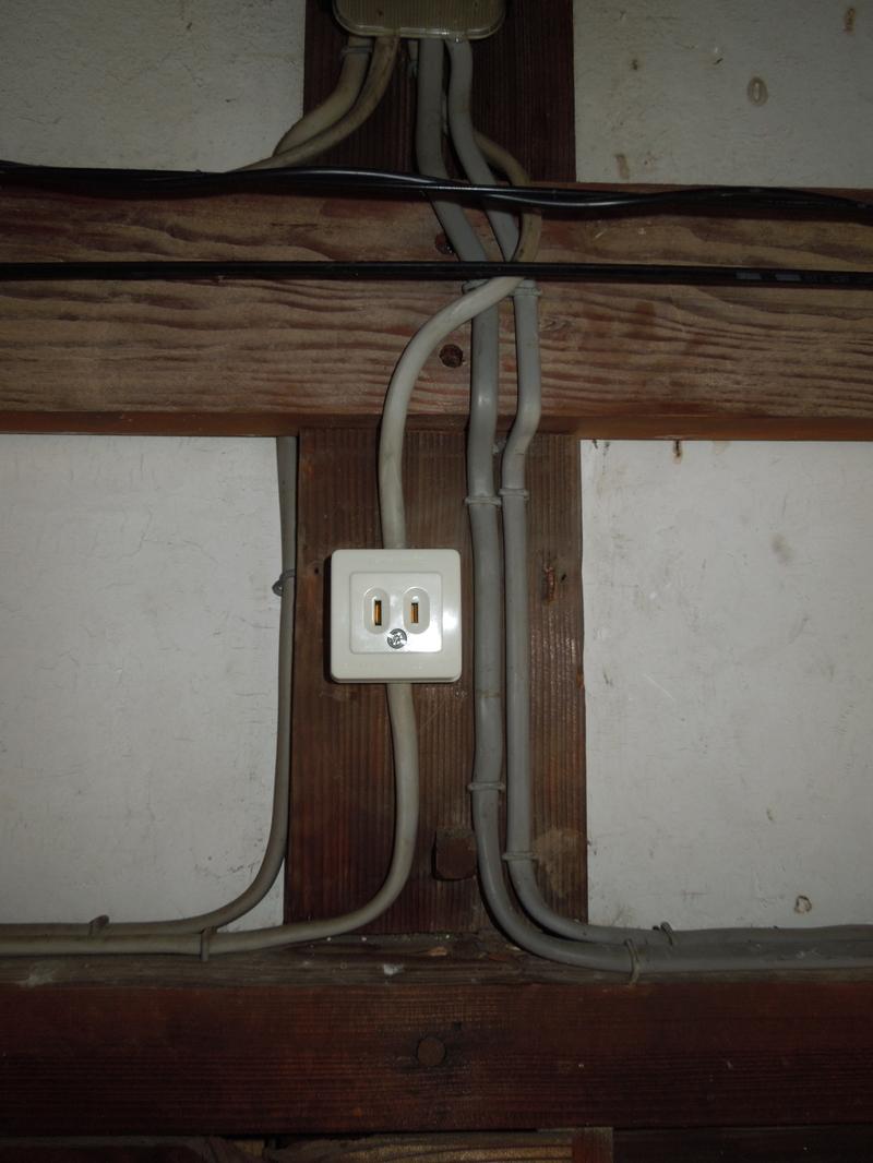 現状の配線を調べて一番簡単そうな方法で、ジョイントボックスから別のジョイントボックスに行っているケーブルの途中に送り端子付き角型コンセントを入れました。