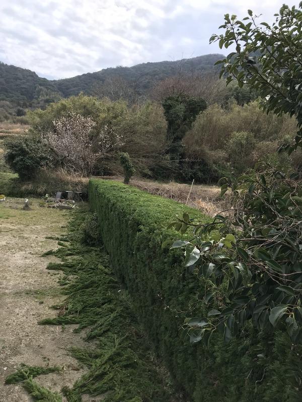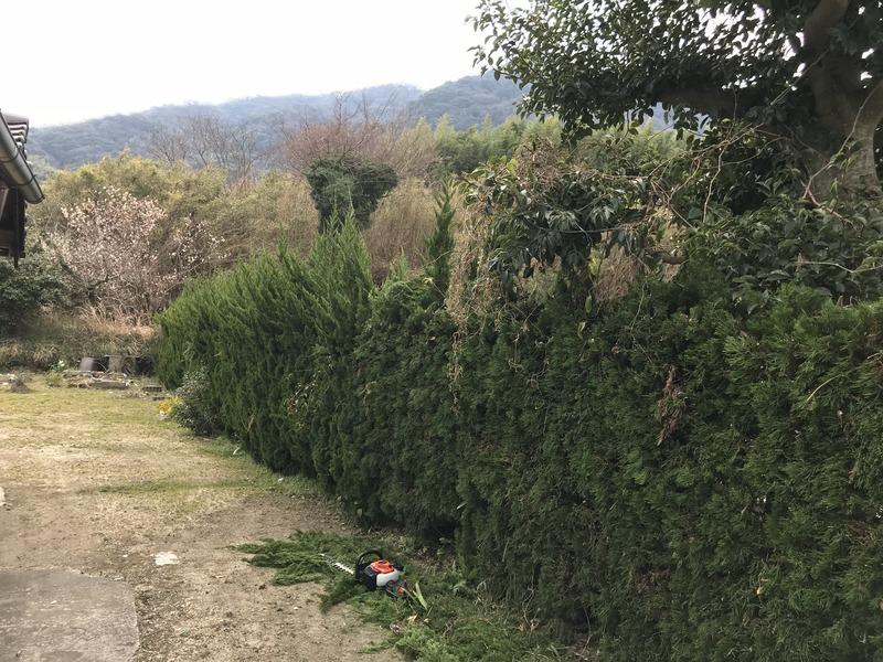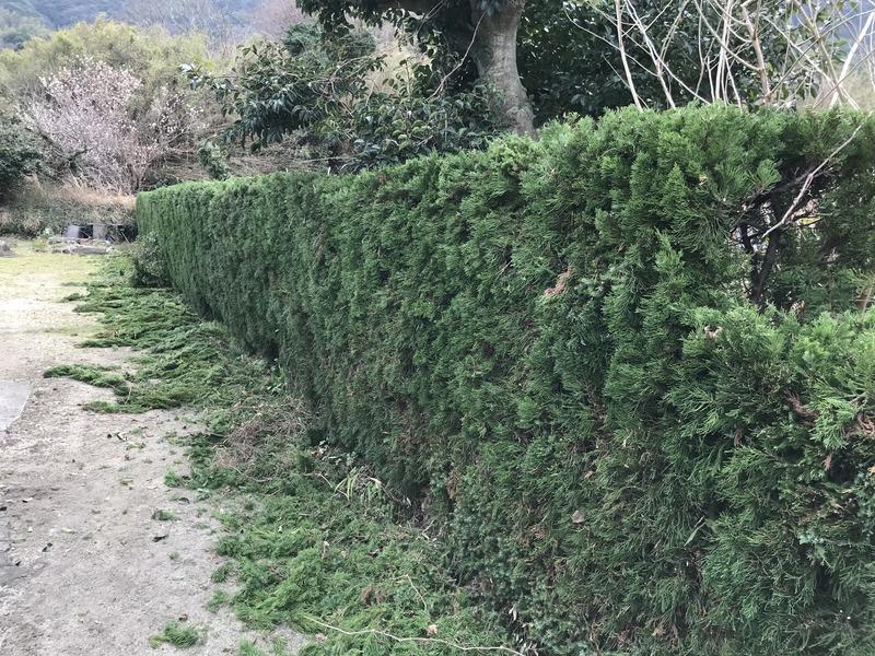 3月10日の記事「畑の生垣を剪定しました」で畑入口のマキの垣を剪定した話を書きましたが、今日は残っていた畑奥のカイズカイブキの剪定をしました。