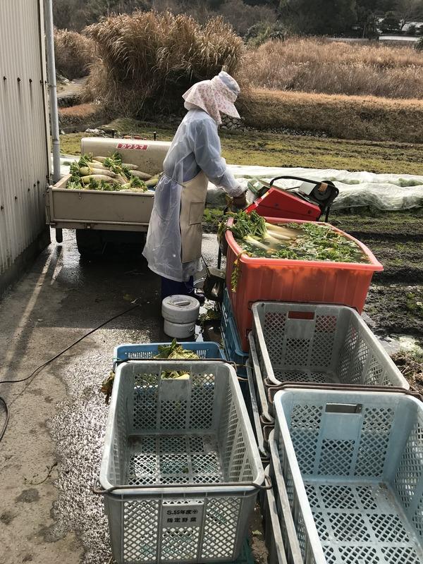 直売所への出荷は前の日に大根を収穫して洗ってヒゲ取りをして準備します。