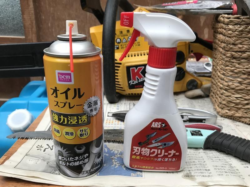 カイズカイブキの葉は油が多いので刃がかなり黒くなっていたので、刃物クリーナーを吹き付けて、しばらくおいてからウェスで拭き取りました。しつこい油汚れでなかなか落ちませんでしたが、この程度にはキレイになりました。