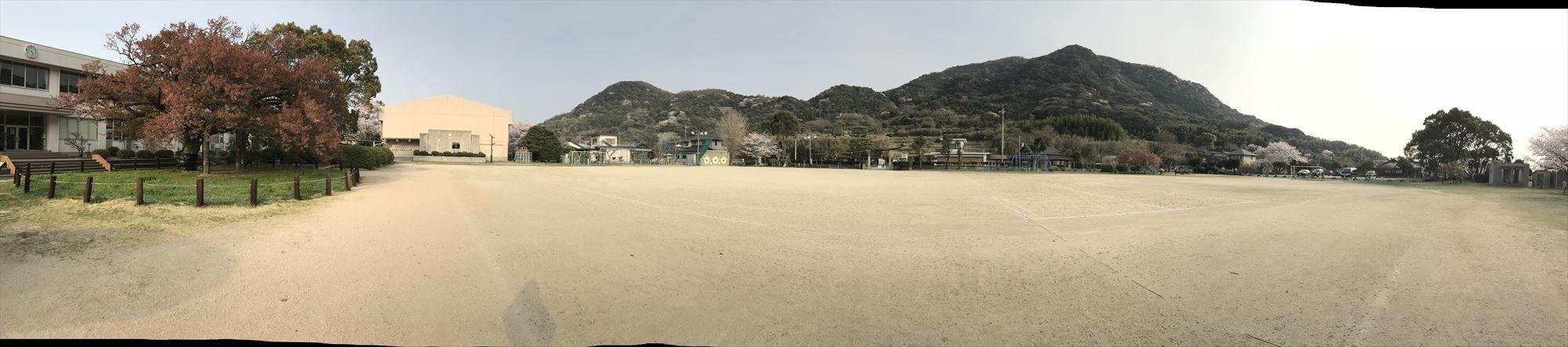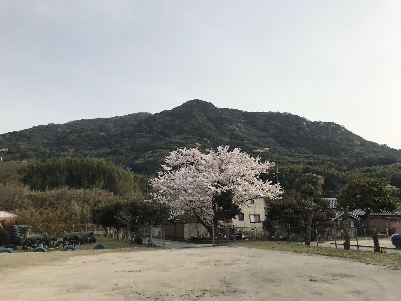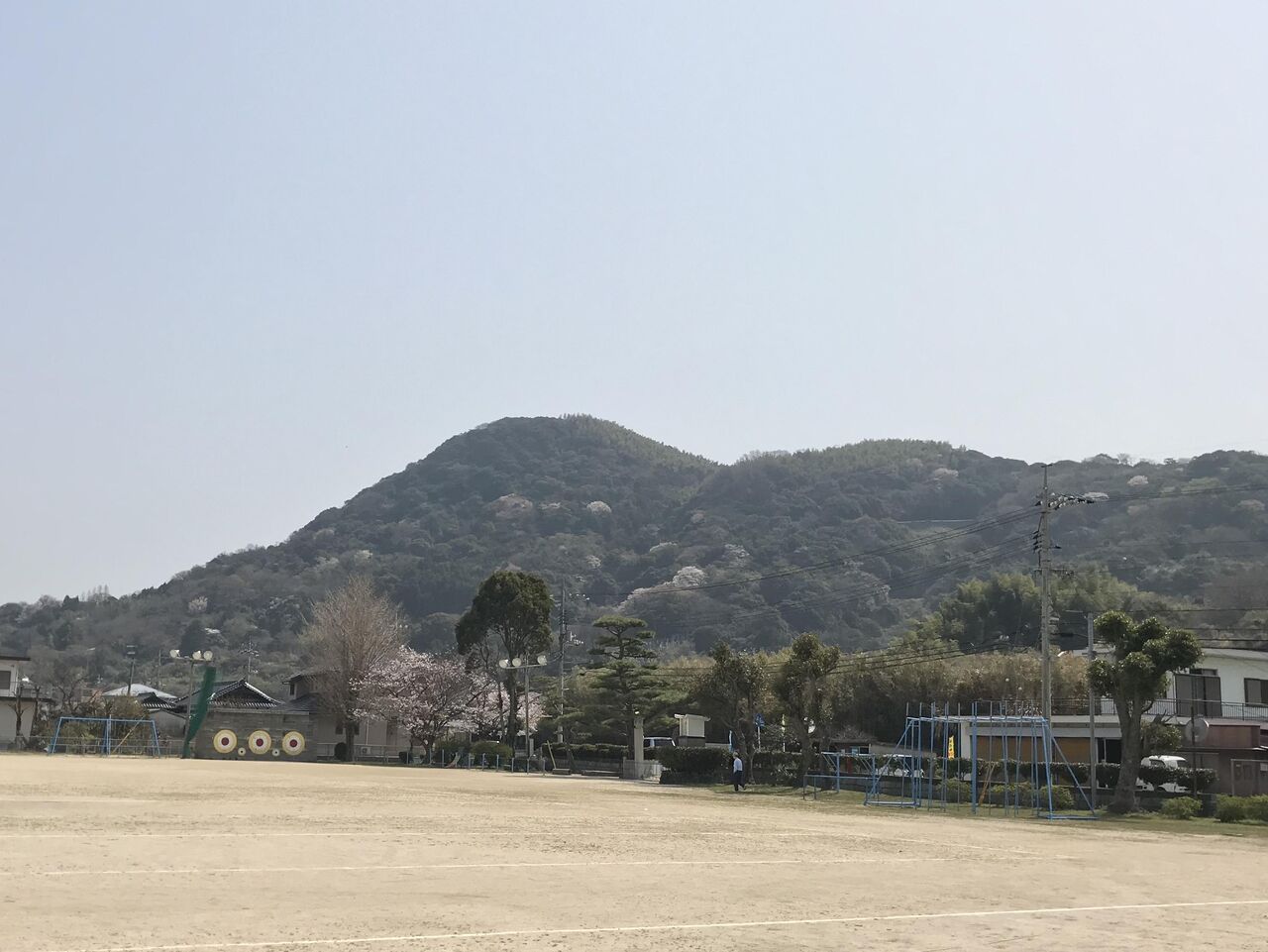 校庭から南を見ると錦山の山桜が咲き出しました。もう少しすると更にきれいになると思います。