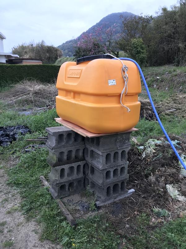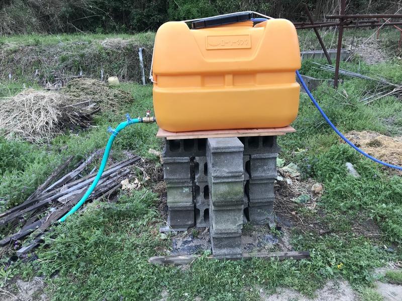 このローリータンクは昨年、水運び用に買ったものですが、溜池から水を引けたので水を溜めておくためのタンクとして使う事にしました。