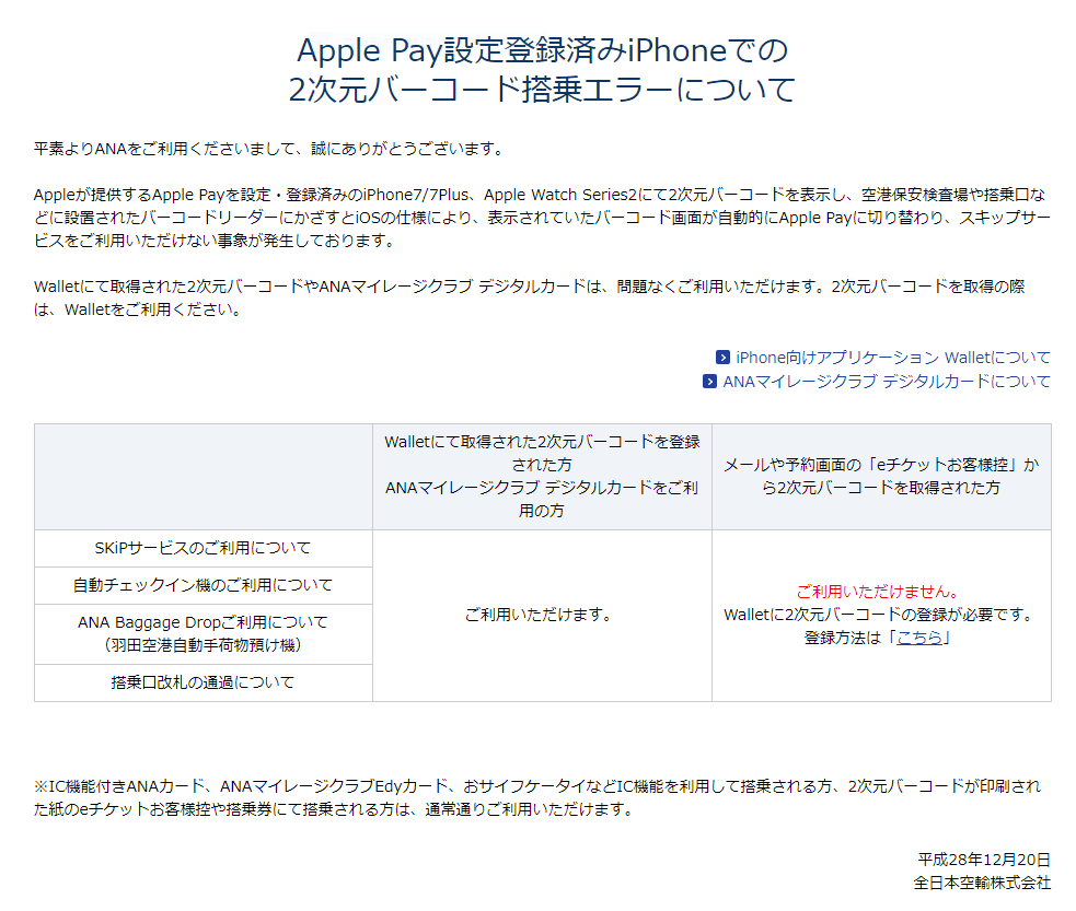 スキップサービスはANAのシステムを共用しているようですが、iPhone7の画面を読み取り機に近づけるとWalletアプリ(ApplePay)が起動してQRコード画面がSuicaの画面に変わってしまいます。