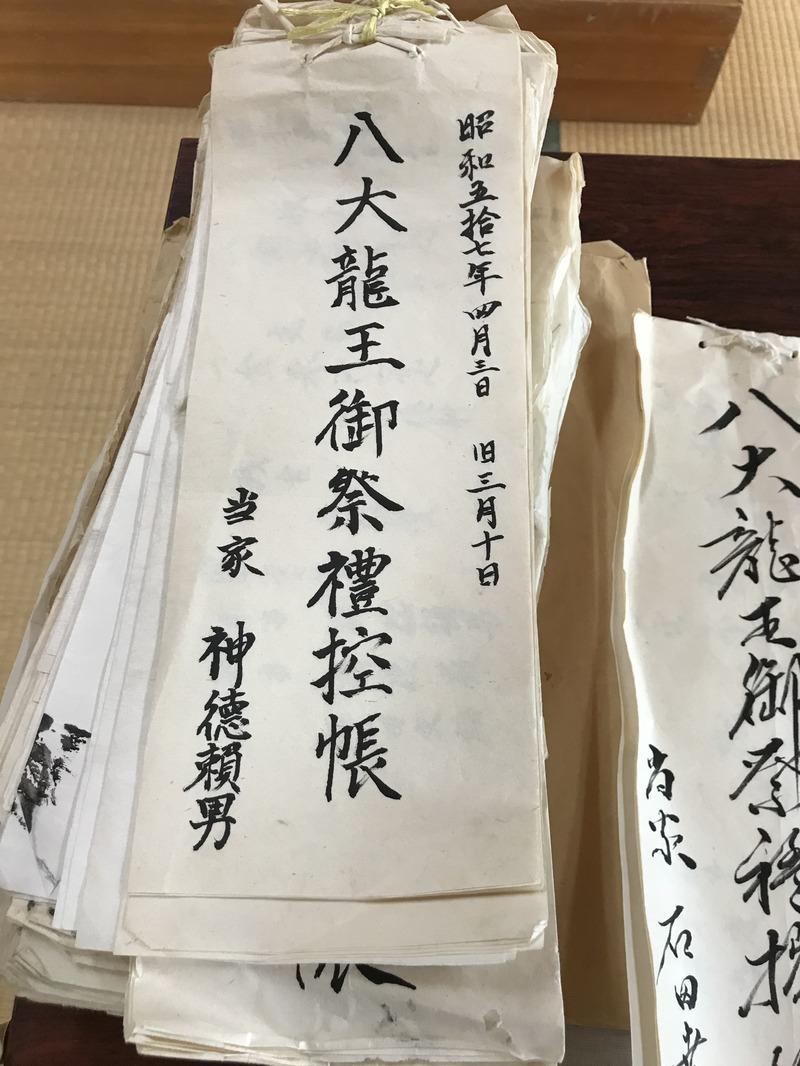 祭壇に昔の覚え書き?が置いてありましたが、「八大龍王祭礼控帳」と書いてあります。
