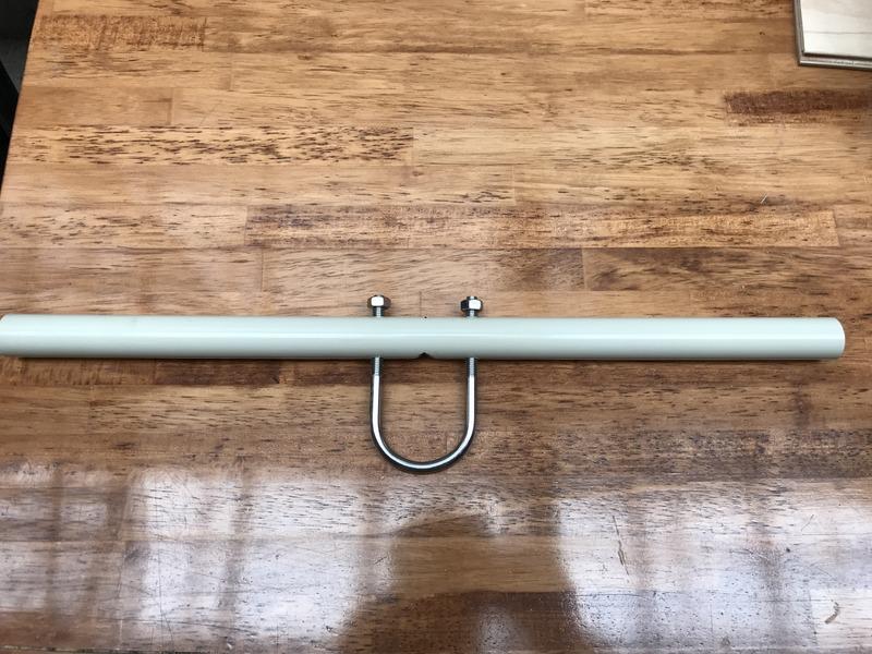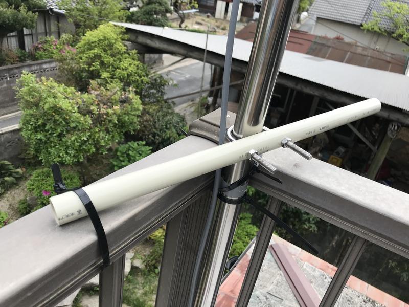余っていた26ΦVE管を40cmに切って、真ん中にUボルト取付け穴を開け、ポールにUボルトで取り付けて手すりにタイラップで止められるようにしました。