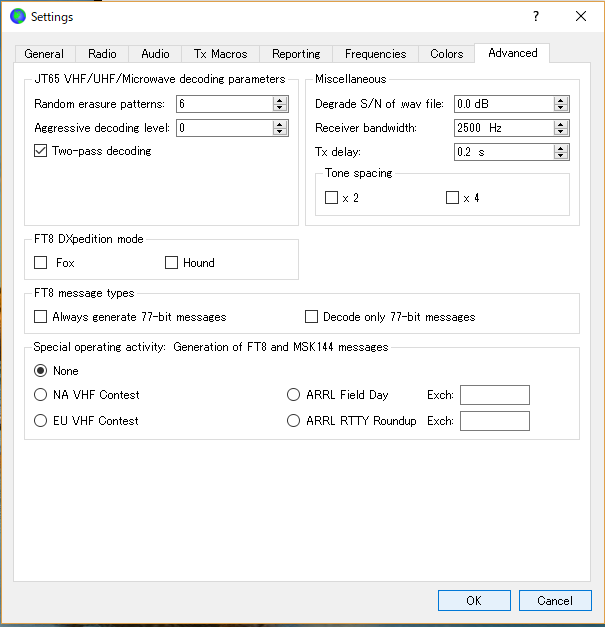設定ではAdvanced設定で FT8 message types と Special operating activity が追加されています。