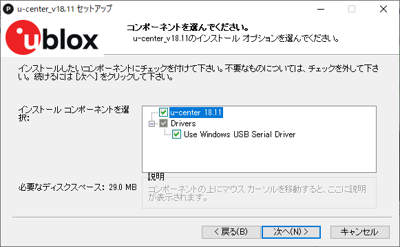 途中でインストールコンポーネントを選択します。文字の小さなQuick guideでは、ドライバーとして「U-box GNSS Device Driver for Windows」の選択がありますが、「Use Windows USB Serial Driver」しか表示されていません。Windows10では選択できないのかもしれません。