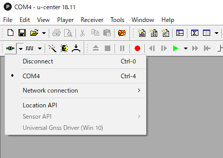 u-center起動後にポートをCOM4(私の環境の場合)に設定します。