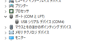パソコンに接続するとシリアルドライバが自動的にインストールされました。私の環境ではCOM4になりました。