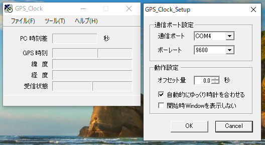 GPS時計を起動して、最初に通信ポートを設定します。ボーレートは9600にしました。オフセットはデフォルトでは0.2秒でしたが、とりあえず0.0秒にしました。