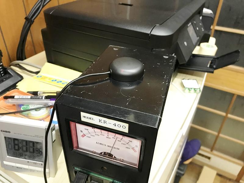 GPSレシーバーは裏側にマグネットが付いているので、とりあえず近くにあったローテーターコントローラーに貼り付けました。(最初、机の上の吊戸棚に裏面が上になる方向で貼り付けたらGPSの電波受信が上手くいきませんでした。カバー側が天を向いていないといけないようです。) 我が家は木造2階建てですが、問題無くGPS電波を受信出来ました。