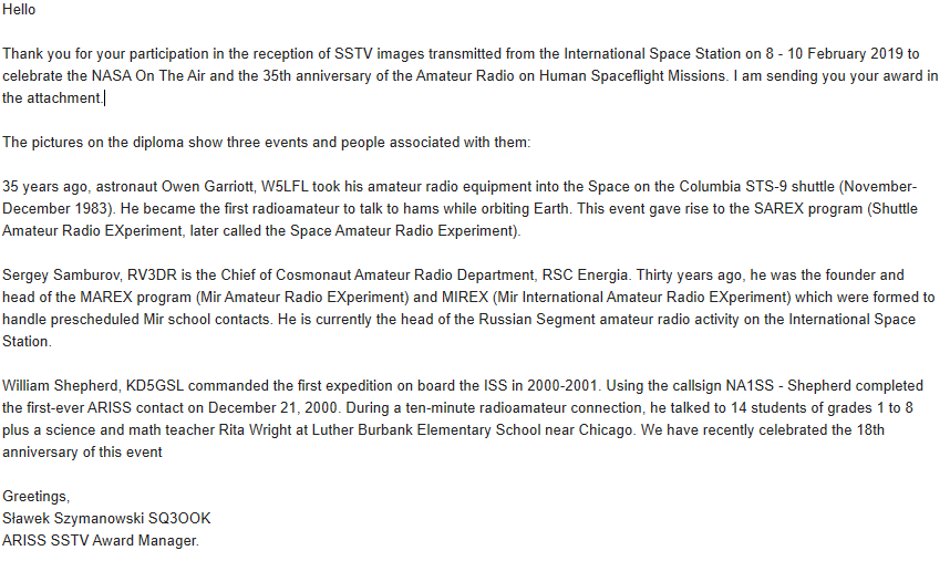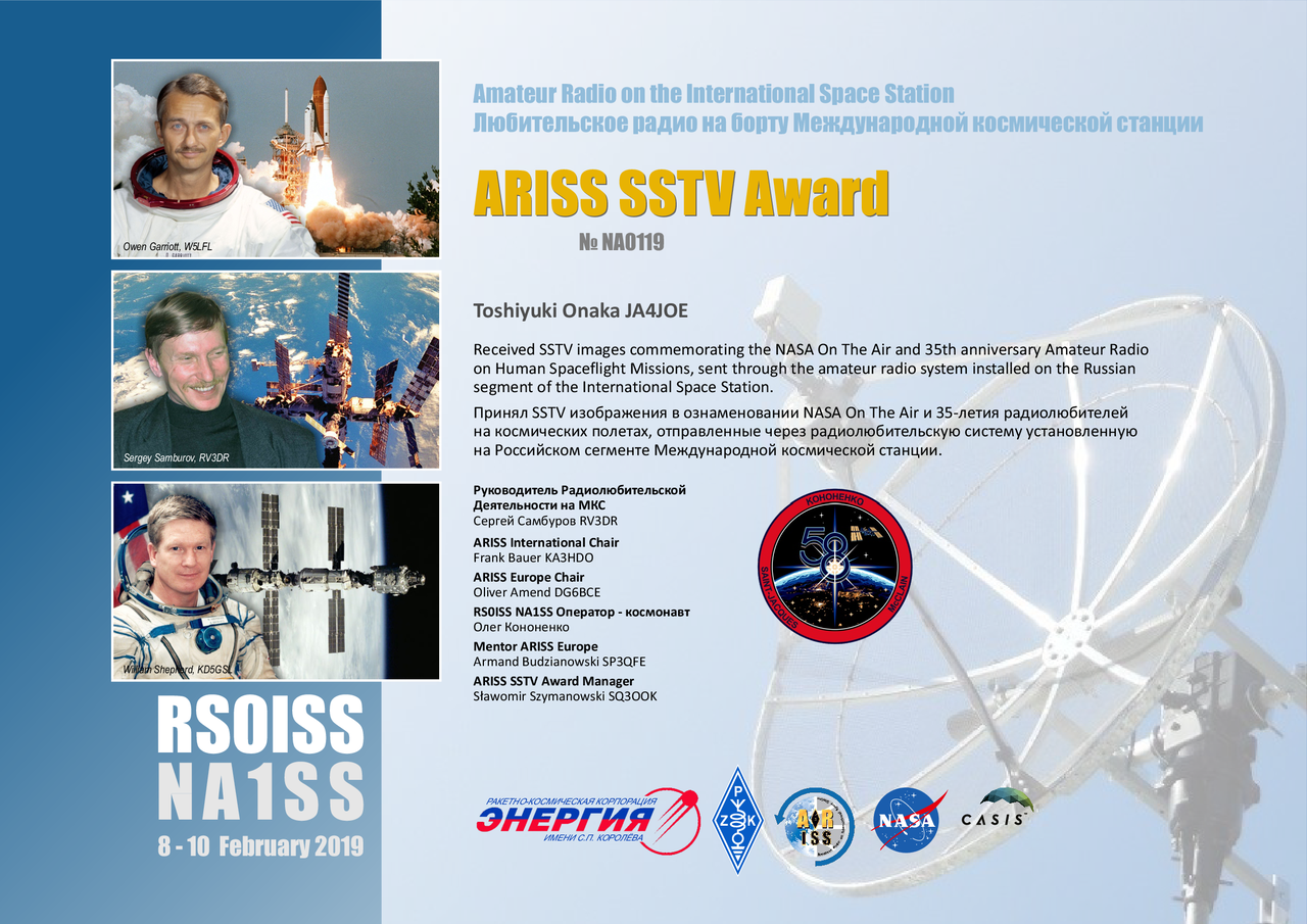 一昨日の記事でISS(国際宇宙ステーション) SSTV画像を受信できたという話を書きましたが、アワードの申請をしたら、さっそく送られてきました。
