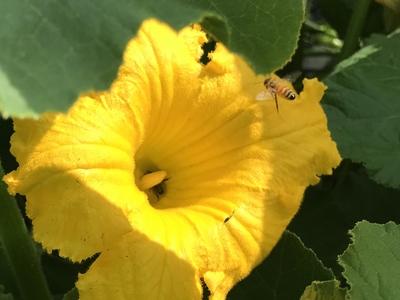 カボチャはこちらに来た次の年(2017年)から作っていて、今年が3度目ですが過去2年は人工授粉させないと実になりませんでした。それが、今年は何故か蜜蜂がたくさんいて花の中にもぐったり飛んだりしています。
