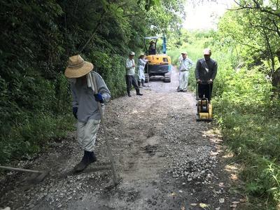 作業は軽トラダンプとトップカーで道路のくぼみに砂利を入れて、ユンボで均してもらって、細かい補修は人力で行いました。