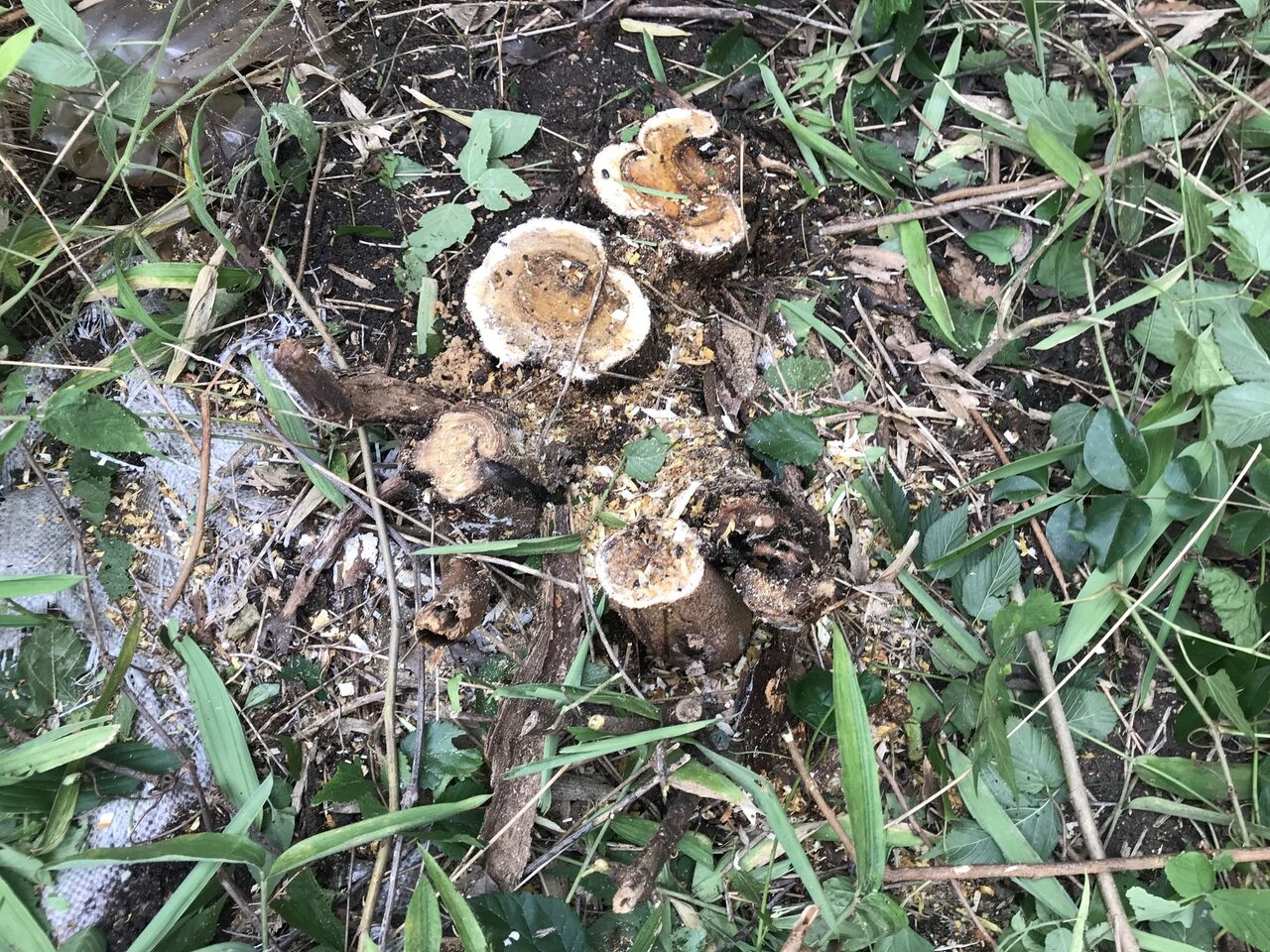 何の木か分かりませんが、成長が速くて秋に剪定しても一夏で茂って邪魔になるので、思い切ってチェーンソーで根元から切りました。