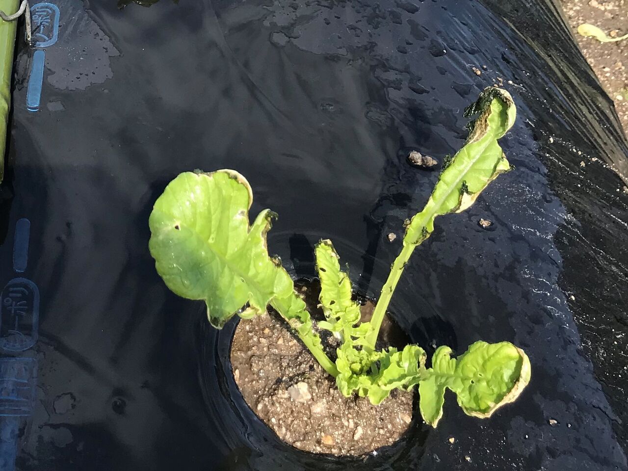 昨日朝、畑に行くとブロッコリが萎れていました。ブロッコリは風で倒れていたので根元に土を寄せておいたのですが、一日でひどく萎れてしまいました。キャベツも少し葉が枯れていますが、こちらは大丈夫そうです。