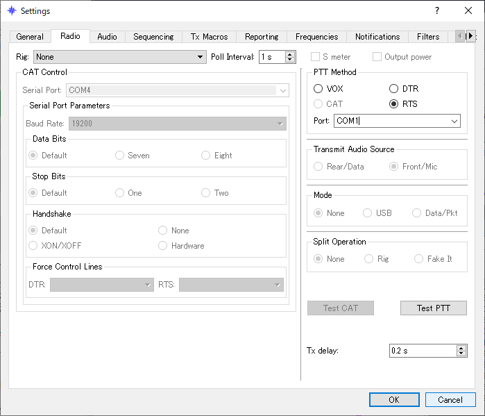 OMさんはJTDXを使いたいとの事だったので、JTDXのRadio設定でRig=None、PTT MethodのPort=COM1(通信ポートRS-232C)に設定しました。