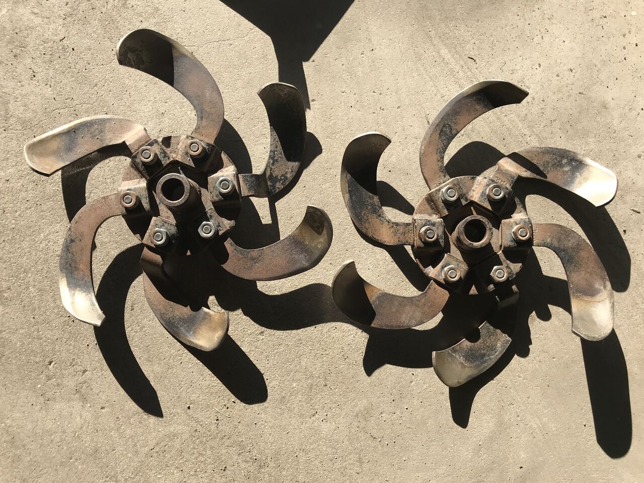 今回はロータリを左右反対に取り付けて、逆転耕うん時に爪が爪先から入らない方向にしました。