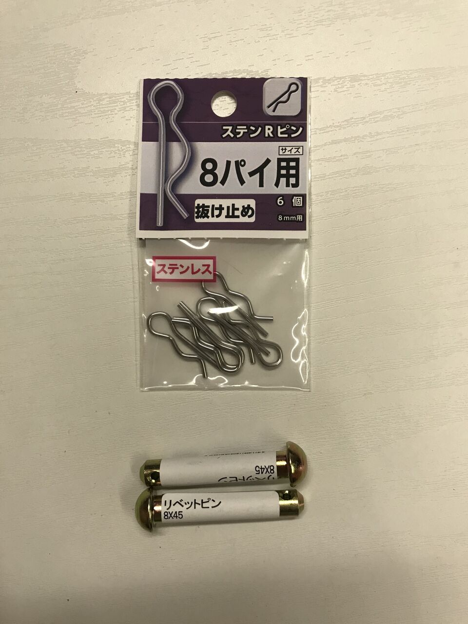 リベットピンもあったので買ってきました。リベットピンは8mmを買ってきたつもりなのですが、なぜか現物は9㎜でした。