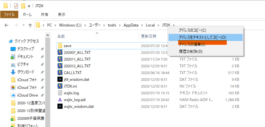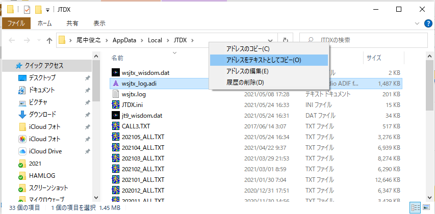 wsjtx_log.adi のパス情報はエクスプローラーで取得することが出来ます。以下JTDXの場合の例です。