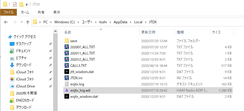 エクスプローラーでJTDXフォルダーを開いてwsjtx_log.adiがある事を確認します。