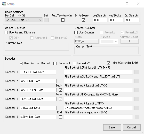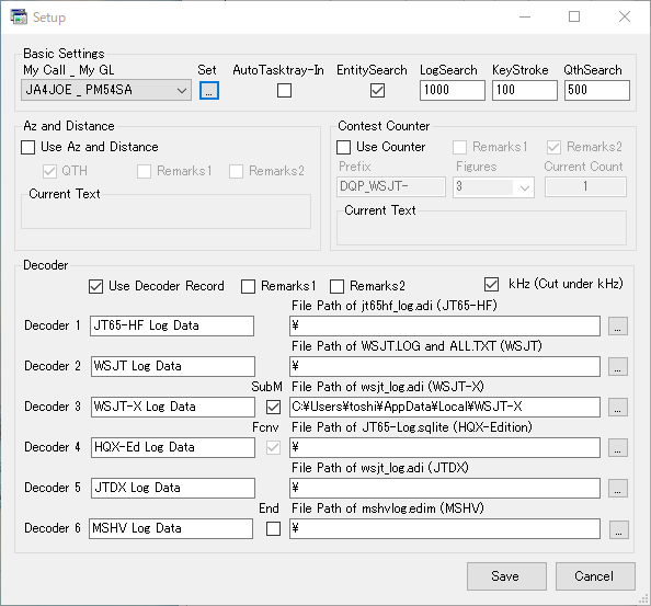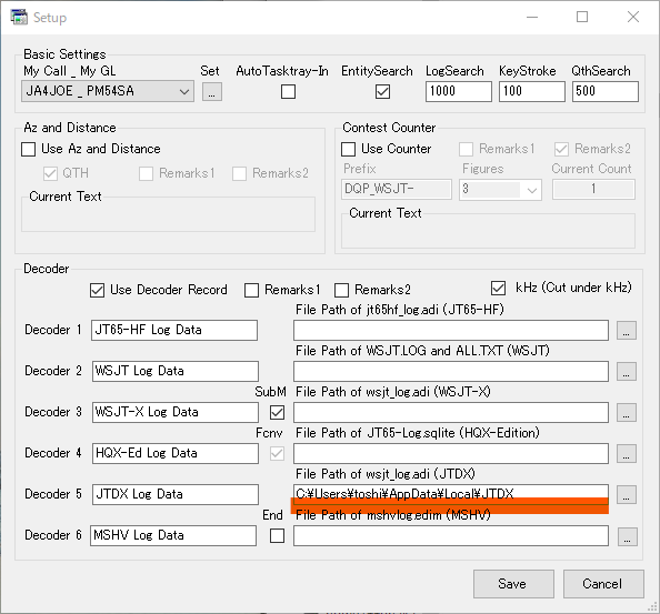 Decoder3の [WSJT-X Log Data] (JTDXの場合[JTDX Log Data] )で指定するFile Path は以下になります。toshiの部分は自分のパソコンのユーザー名になります。(\はWindowsでは¥小文字で入力してください。)