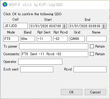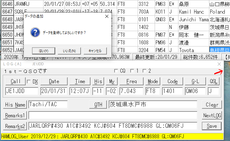 2. の運用では、QSO後にHamlogまで、一気に登録できますが、1. の運用ではQSOをログボタンを押し、小ウインドウがでたら、OKを押さないとHamlogへの登録が出来ません。