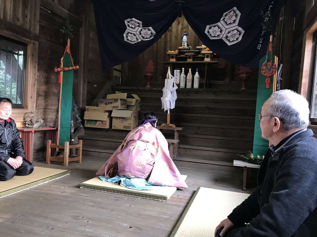 神事は3時半からで、いつもの女性神主さんです。時間は毎年、掛け持ちで神事をされている神主さんに合わせて決められています。