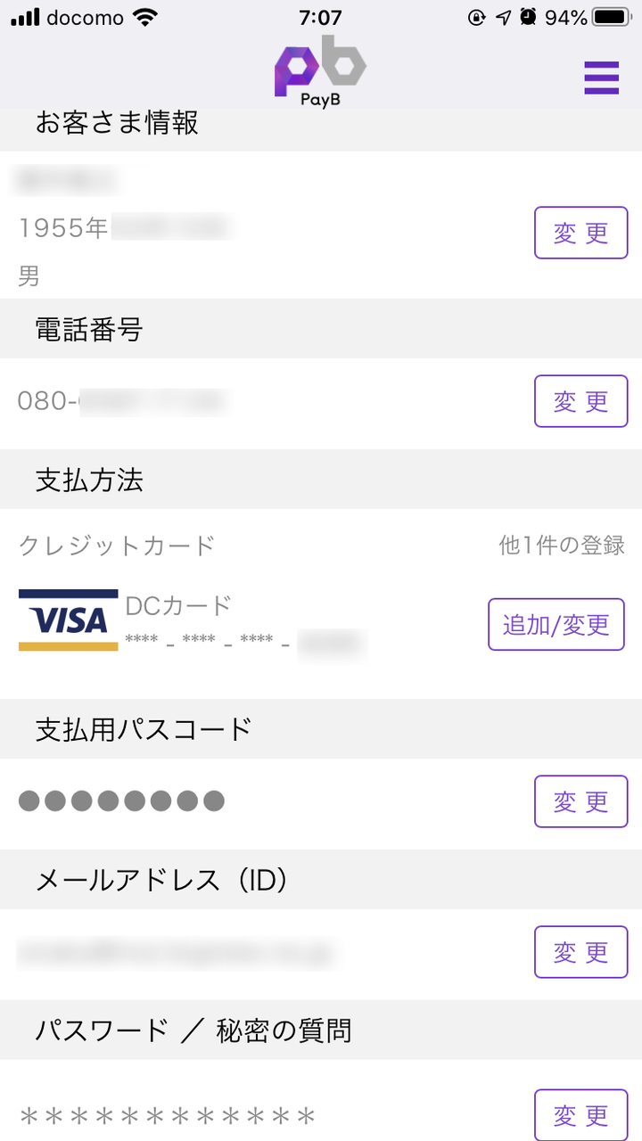 PayBのアプリをiPhoneにダウンロードして、生年月日、携帯電話番号、メールアドレス、支払いクレジットカード、支払用パスコードなどを登録しました。