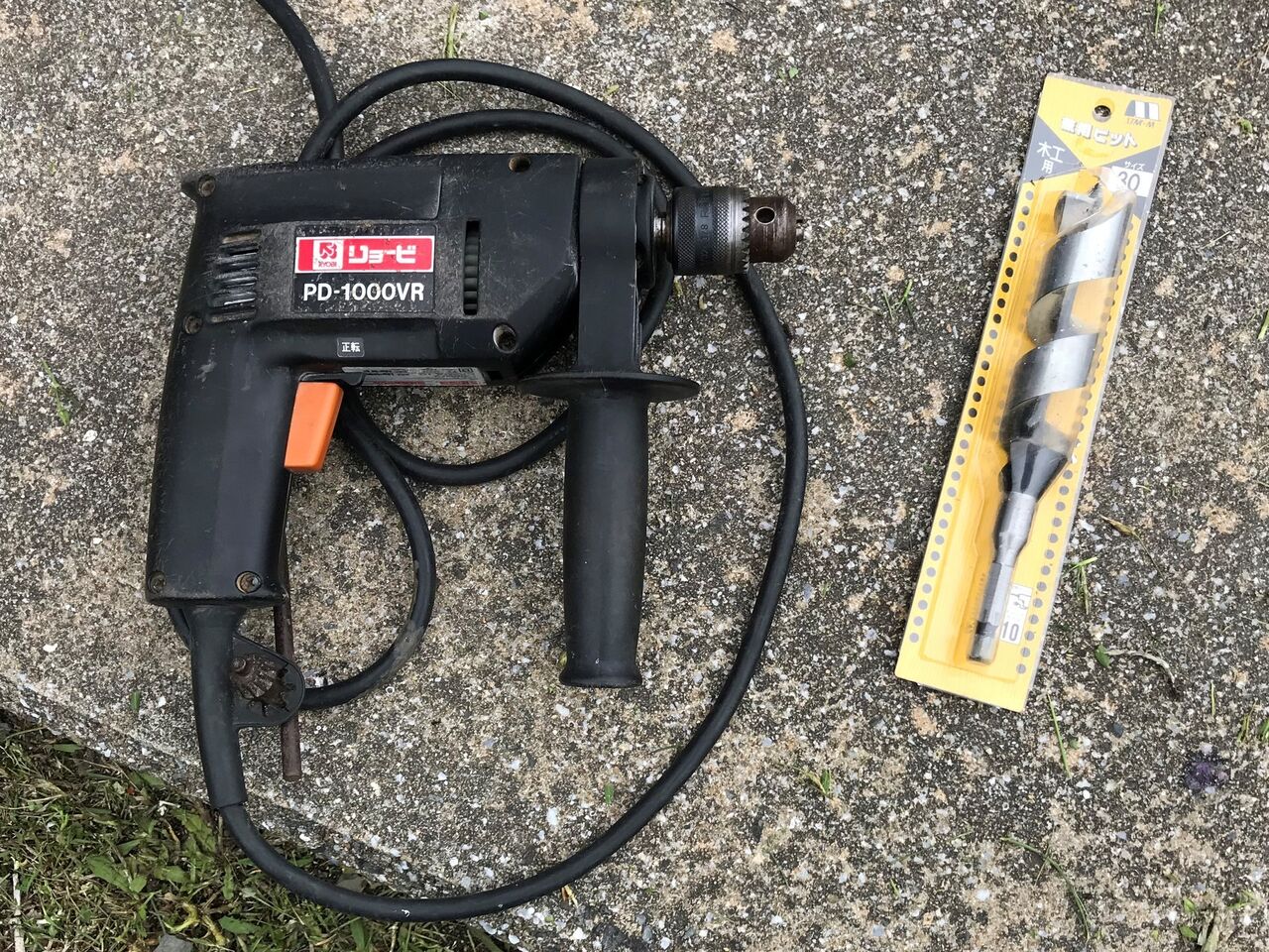 私の振動ドリルと用意してあった30mm木工ドリルビットです。