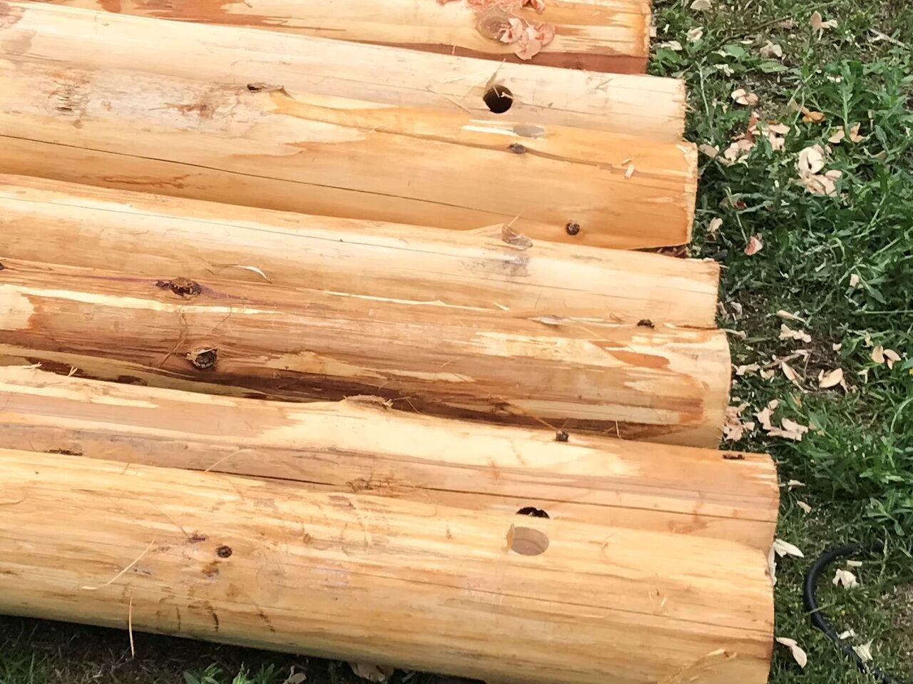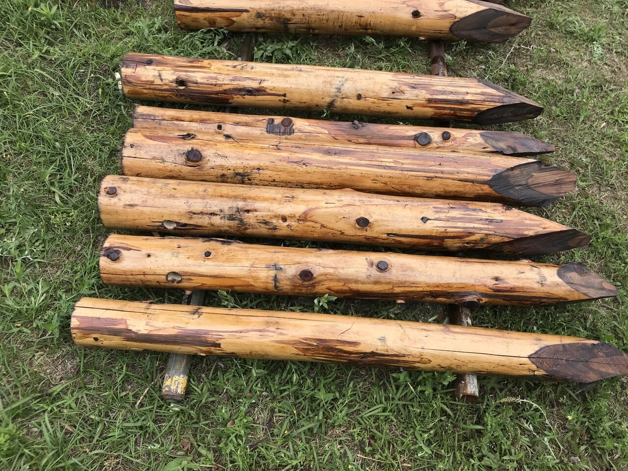 穴開けが終わった木杭には防腐剤(クレオソート)を塗りました。