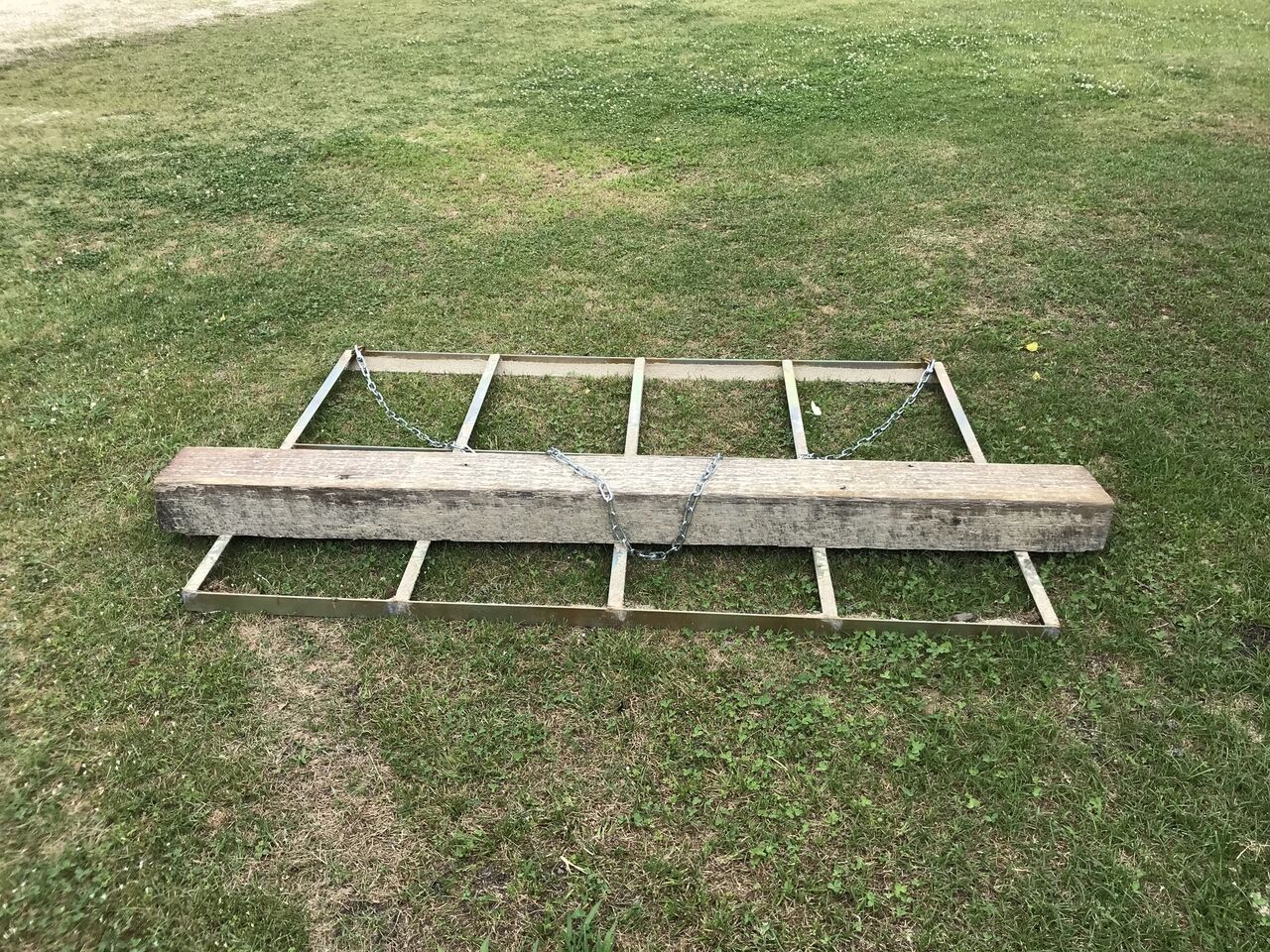 鉄枠に鎖を付けたもので、重しの枕木が乗せてある簡単なものですが、地面を削るので草も削られるようです。