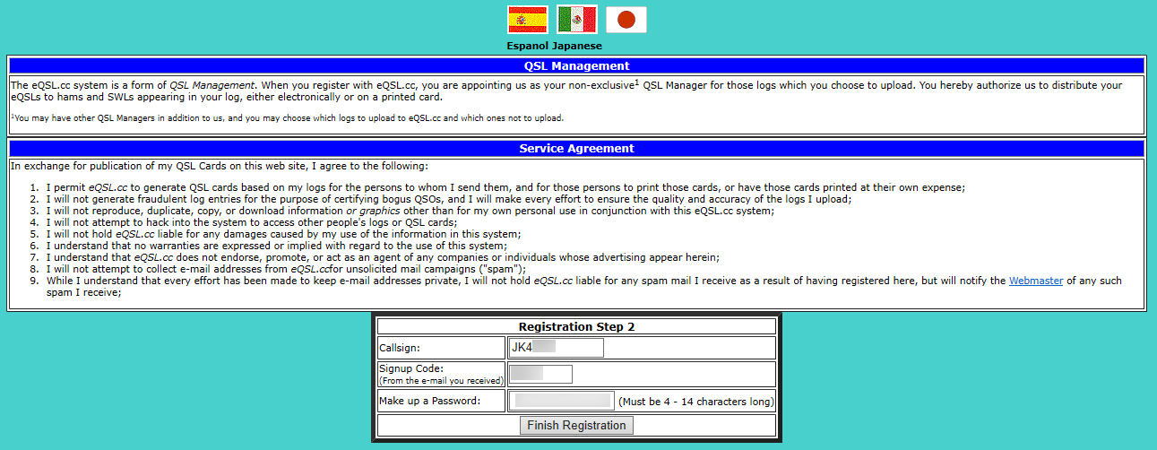 コールサイン、メールで受け取ったコード、登録したいパスワードを入力してFinish Registrationをクリックします。