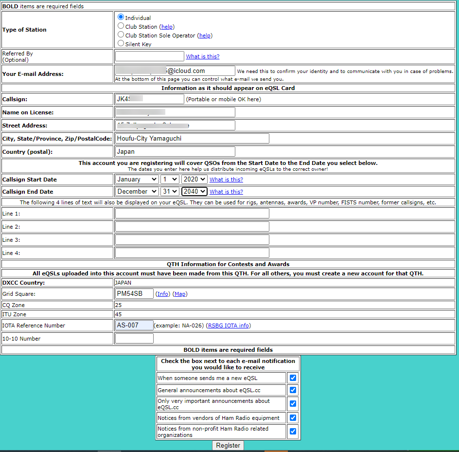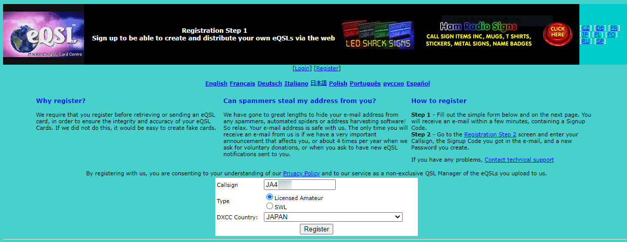 eQSL.ccのホーム画面でRegisterを選びます。