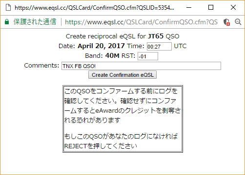 処理の✓マークをチェックするとコンファーム画面が表示されるので、HAMLOGのログを確認しながら、交信時刻(UTCに変換)、RST、Comments を記入して「Create Confirmation eQSL」を押します。