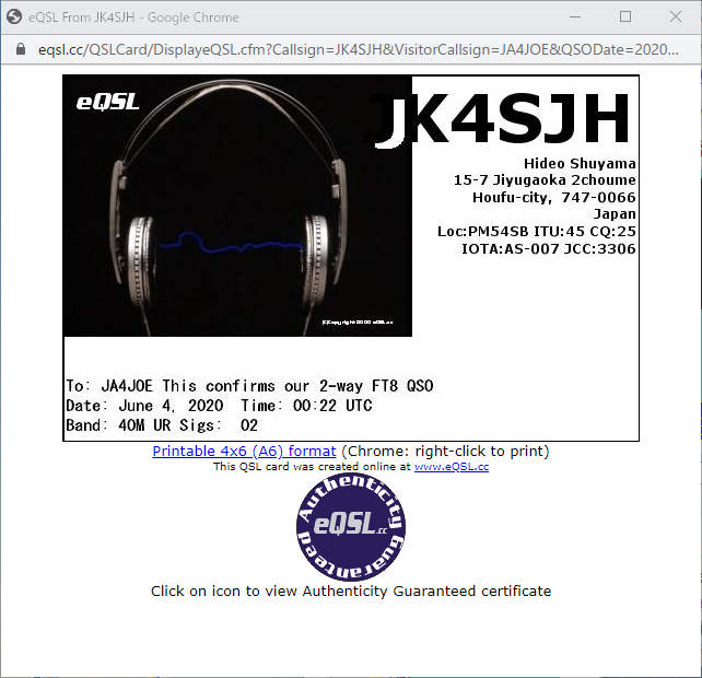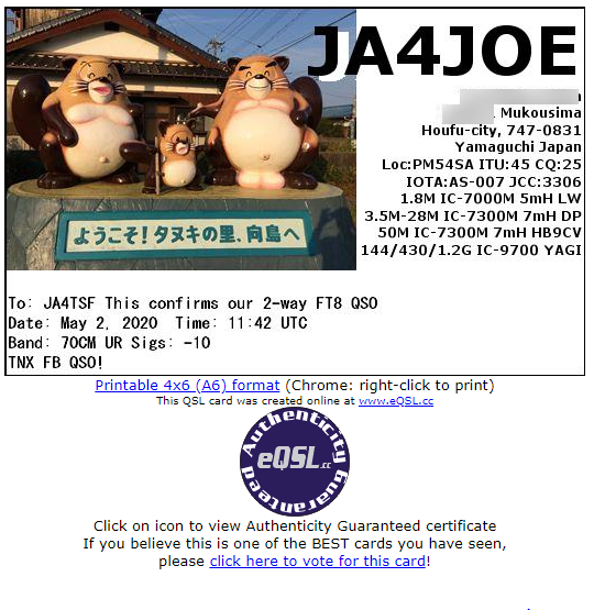 [Display as Card]で発行カードの画像を確認できます。私のeQSLカードです。