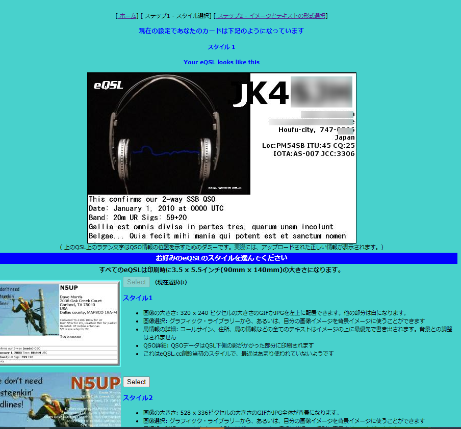 [Step 1 - Choose Style] [Step 2 - Select image] [Step 3 - Text layout] の順で自分のQSLカードを作成します。