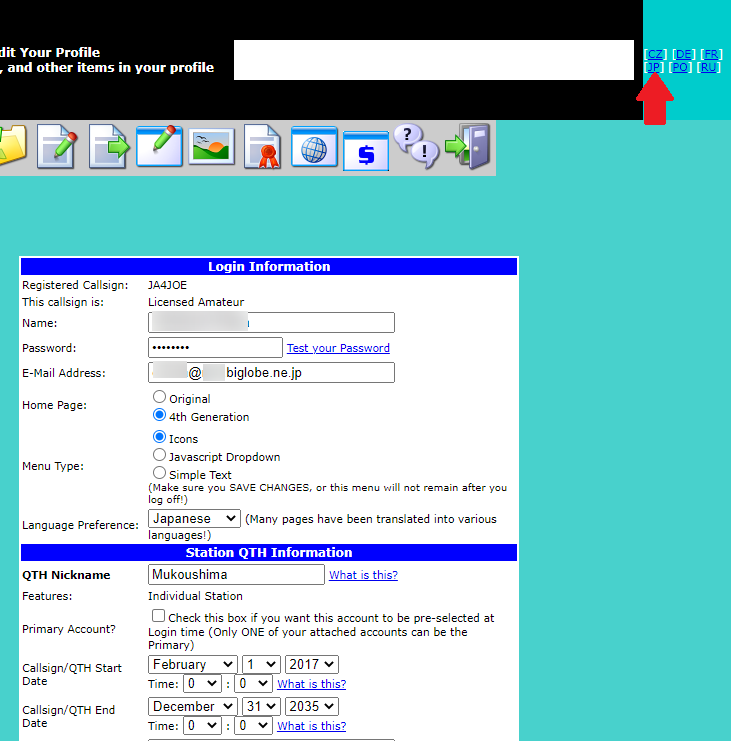 右上の言語選択で[JP]を選びます。これにより、以降のeQSL.cc画面が日本語表示されます。