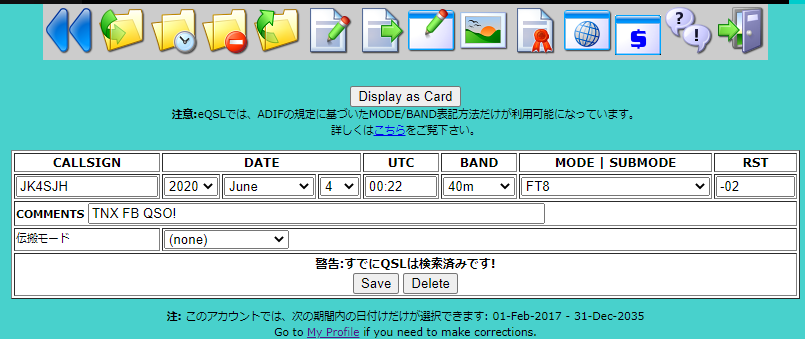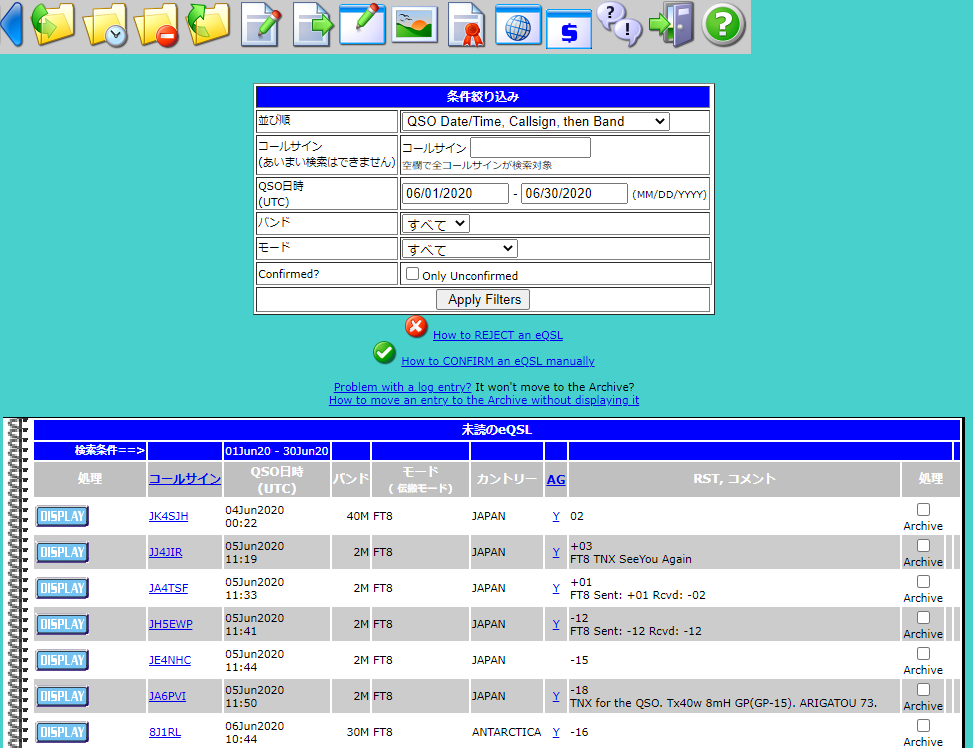 なお、eQSLを使い出してからも、こちらからeQSLを発行していないのに相手からeQSLを送ってきている場合にこの状態になります。多くの場合、日付時間の間違い、/x(移動)の違いなどが原因です。相手の間違いならxをチェックしてリジェクトし、間違っている旨を知らせます。