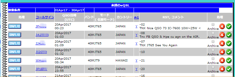 相手からeQSLを送ってきていて、こちらから送っていない場合右端の処理欄に☓と✓マークがついています。