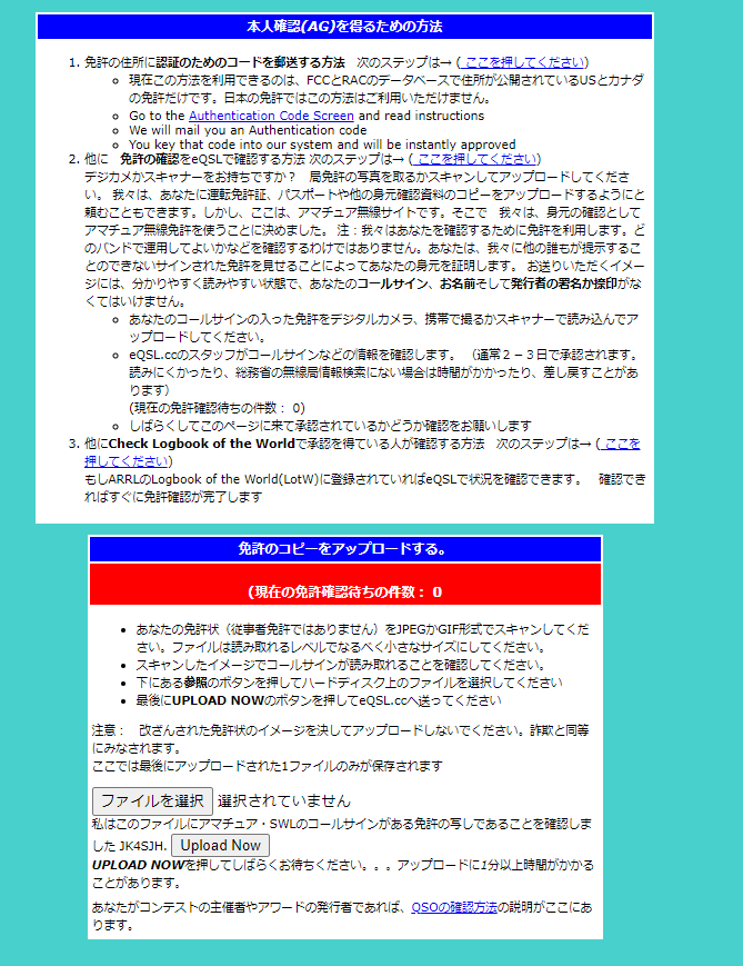 本人確認をすると交信相手のeQSL情報にeQSL(AG)と表示されるようになります。
