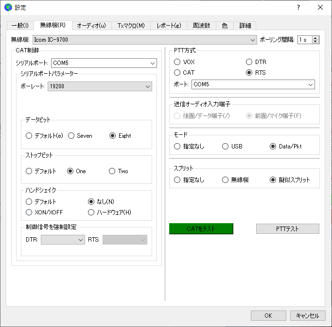 上記までの設定後に[OK]を押していったん設定終了後に、再度設定を [無線機] にして[CATをテスト] ボタンをクリックして緑色になれば CATによるIC-9700の制御が出来ています。
