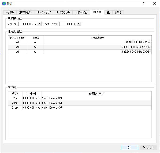 144MHz/430MHz/1200MHzの周波数のみを追加して、他の周波数は削除しました。削除はSHIFT+左クリックで選択して、まとめて削除できます。