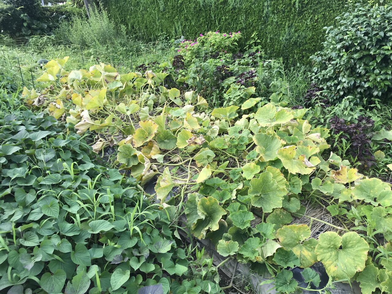 カボチャは長期の大雨のせいで根が傷んだようで枯れてきました。
