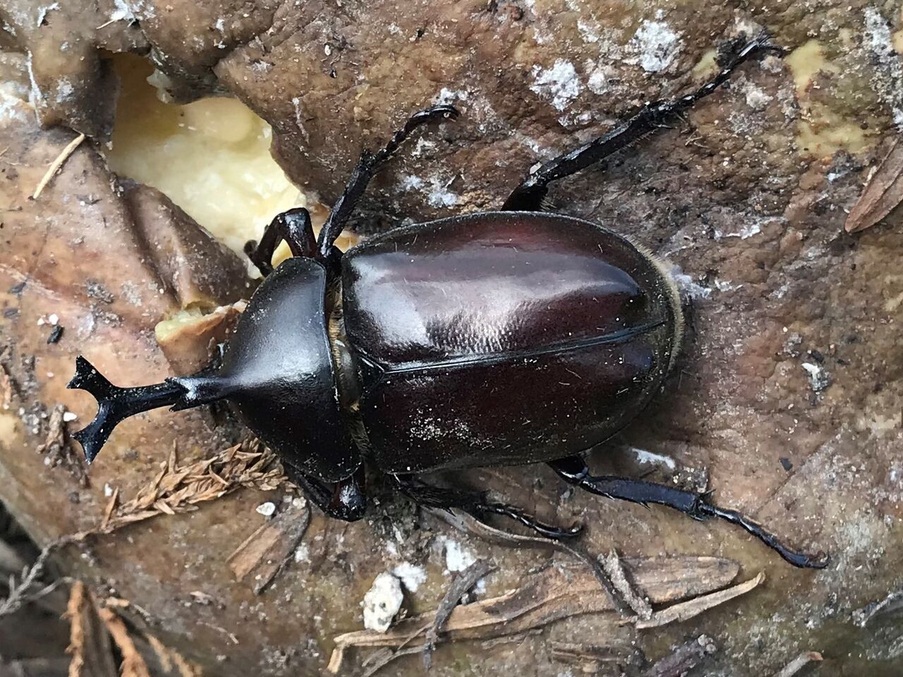 おまけですが、スイカの腐った実を山側の空き地に移動しておいたら、カブトムシが寄ってきていました。(^^;