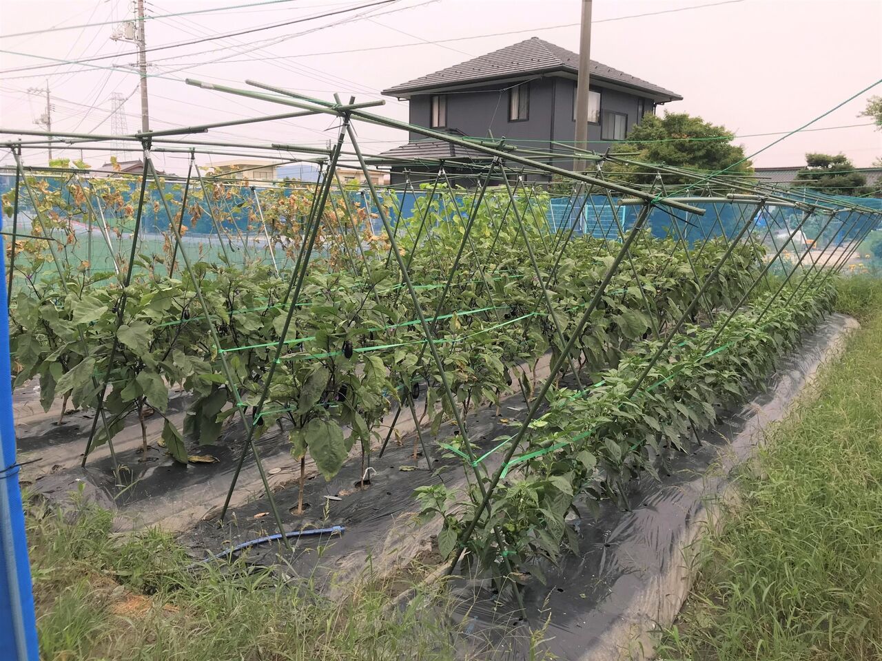 東側畑です。昨日、ピーマンとナスの2段目の誘引テープを張りました。ナスは誘引までやりました。